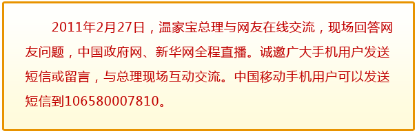 [中國移動(dòng)用戶手機(jī)尾號7776]:總理,您好。很多百姓都好奇,作為總理,生活跟普通百姓有什么不同?您會(huì)像普通父母那樣經(jīng)常跟子女聊聊工作、生活嗎?您會(huì)走走親戚、與朋友、同學(xué)聚聚會(huì)嗎? |