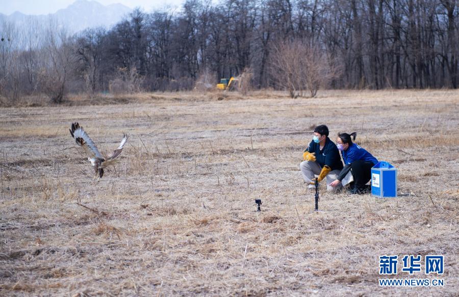3月20日,北京猛禽救助中心猛禽康復(fù)師戴暢(右)和周蕾放飛大鵟。新華社記者 陳鐘昊 攝