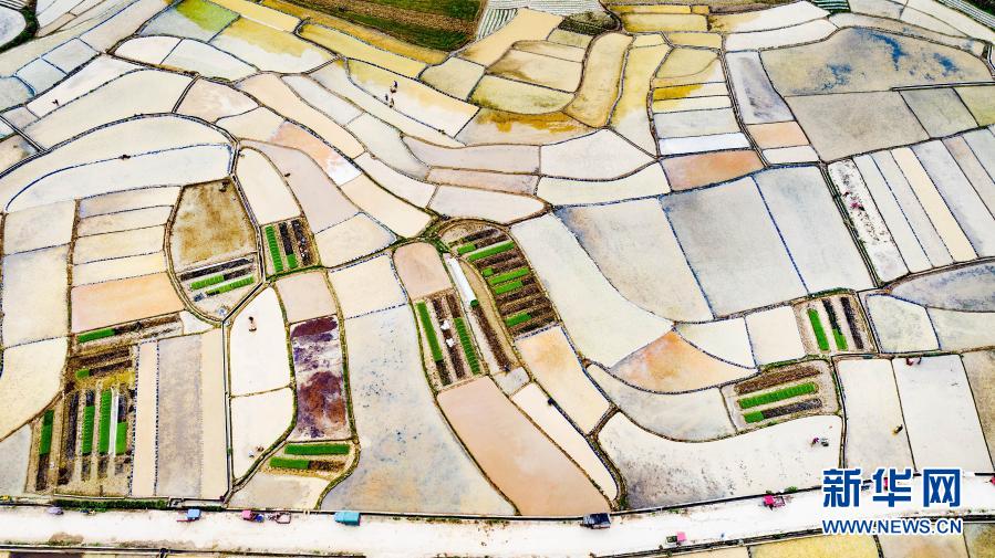 3月24日,廣西河池市東蘭縣武篆鎮(zhèn)色故村農民在田間勞作(無人機照片)。