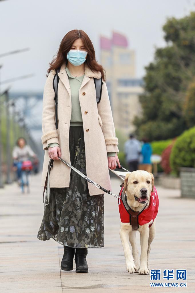 導盲犬“Bingo”陪伴李靜在南京長江邊的景觀帶散步(3月27日攝)?! ⌒氯A社發(fā) (張夢 攝)