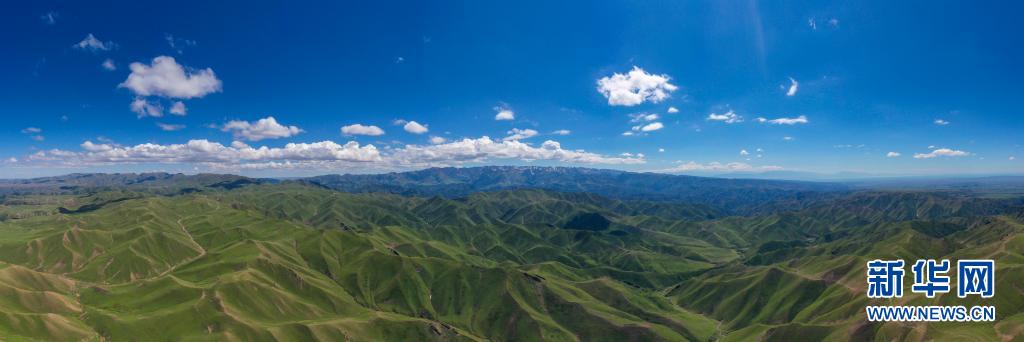 新疆北部裕民縣巴爾魯克山區(qū)夏牧場(6月15日攝,無人機(jī)全景照片)。