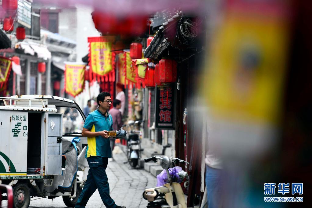 6月20日,在微山縣南陽鎮(zhèn),郵遞員王少朋在投遞郵件。
