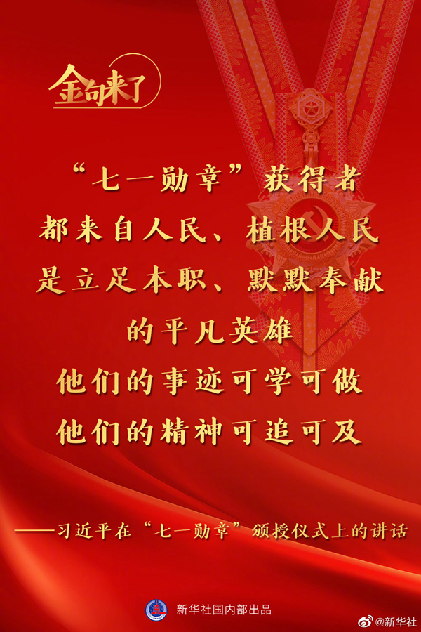 習(xí)近平說,“七一勛章”獲得者都來自人民、植根人民,是立足本職、默默奉獻的平凡英雄。他們的事跡可學(xué)可做,他們的精神可追可及。他們用行動證明,只要堅定理想信念、堅定奮斗意志、堅定恒心韌勁,平常時候看得出來、關(guān)鍵時刻站得出來、危難關(guān)頭豁得出來,每名黨員都能夠在民族復(fù)興的偉業(yè)中為黨和人民建功立業(yè)!