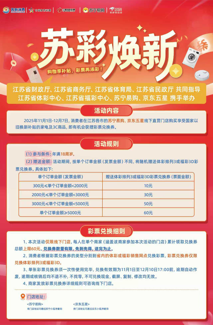 11月1日,在江苏省财政厅、江苏省商务厅、江苏省民政厅、江苏省体育局共同指导下,江苏省体育彩票管理中心和江苏省福利彩票管理中心启动“苏彩焕新”第四期活动。本次活动将持续至12月7日,活动期间,消费者在江苏省内13个市的苏宁易购、京东五星线下直营门店购买享受国家以旧换新补贴(以下简称国补)指定商品(家电、3C商品),即有机会获赠彩票兑换券。