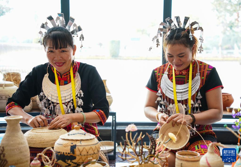4月22日,黎族同胞在展示黎族藤竹编技艺。