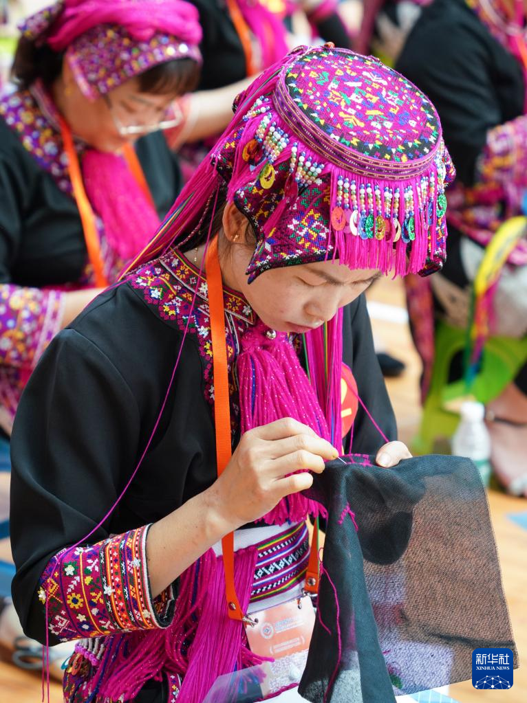 4月23日,在海南省乐东黎族自治县,绣娘在黎锦苗绣技艺比赛现场制作苗绣。