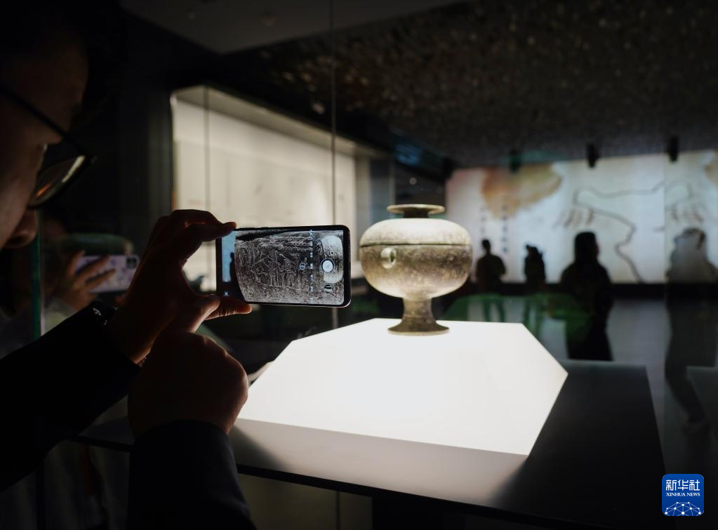 4月27日,参观者在罗家坝遗址博物馆拍摄展出的水陆攻战纹铜豆。