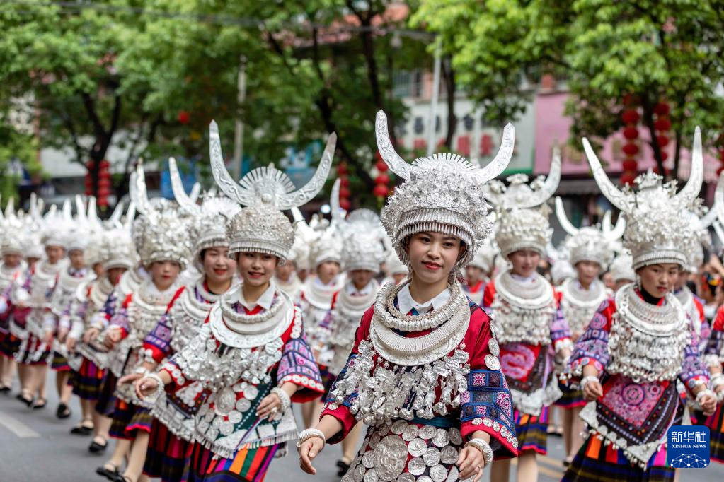 5月2日,人们在贵州省台江县参加苗族姊妹节盛装巡游。
