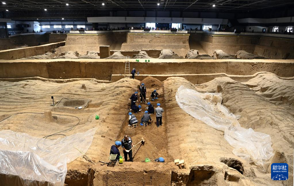 工作人员在秦兵马俑二号坑遗址进行发掘工作(4月26日摄)。