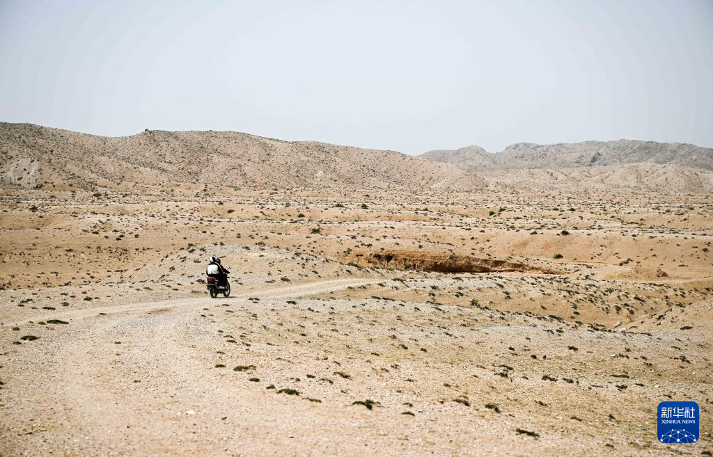 5月13日,驼峰(长城)文物保护队员骑着摩托车在阿拉善左旗一处戈壁滩上行驶。