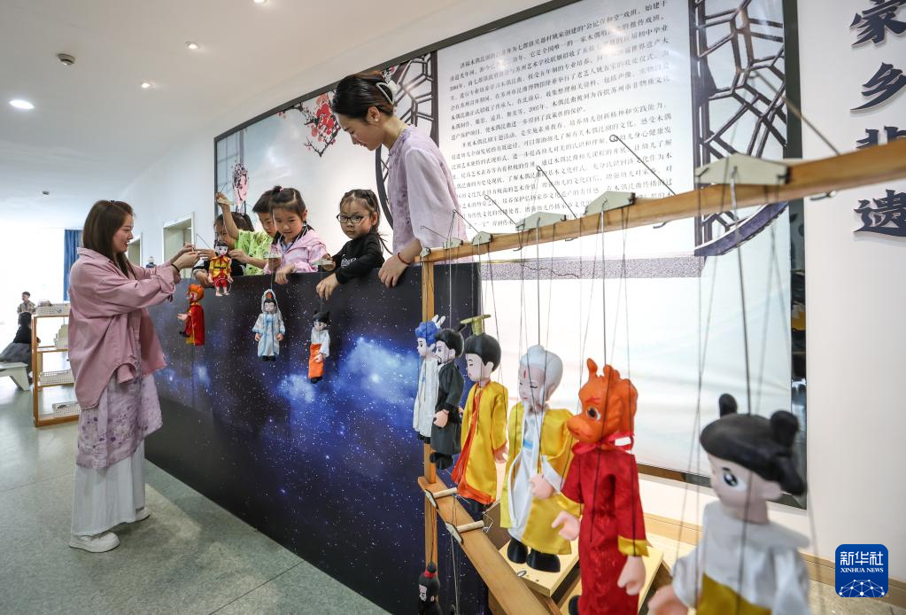 孙菁(前左)和施锦芳在七都镇江村文化礼堂表演昆曲木偶(5月17日摄)。