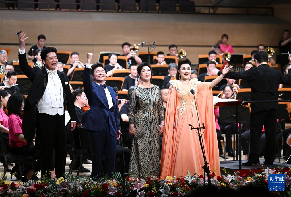 5月25日,在天津大剧院音乐厅,歌唱家王泽南(左一)、王宏伟(左二)、关牧村(左三)、张晏蓉等在舞台上演出。
