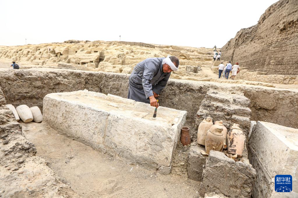 这是5月27日在埃及塞加拉地区考古挖掘现场拍摄的在木乃伊制作过程中用到的陶罐。