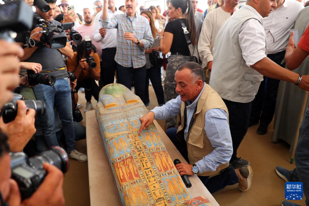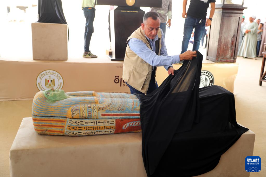 5月27日,在埃及塞加拉地区举行的考古新闻发布会上,埃及最高文物委员会秘书长穆斯塔法·瓦齐里介绍一具彩绘木乃伊木棺。