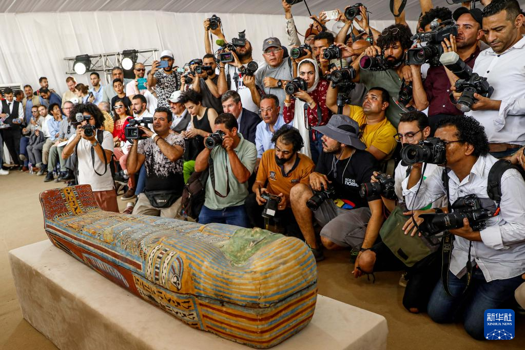 5月27日,媒体记者在埃及塞加拉地区举行的考古新闻发布会上拍摄一具彩绘木乃伊木棺。