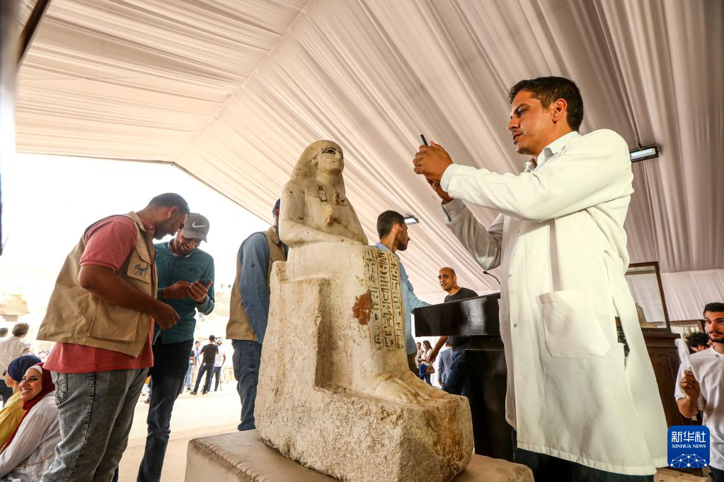 这是5月27日在埃及塞加拉地区举行的考古新闻发布会上拍摄的一尊雕像。