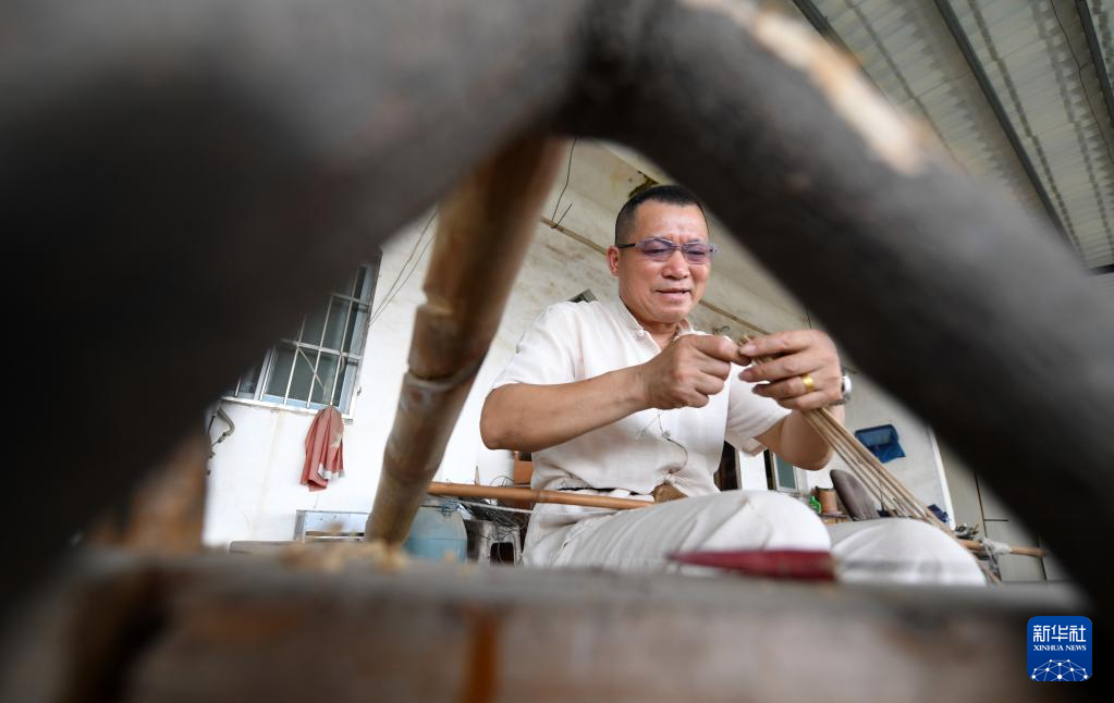 6月1日,在广西宾阳县宾州镇陆村,陆云岗在剖竹篾准备制作油纸伞。