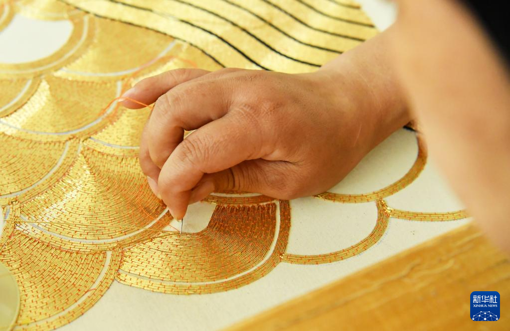 6月13日,河北省肃宁县邵庄乡东高家口村一家戏曲服装厂的工人在绣制戏曲服装。