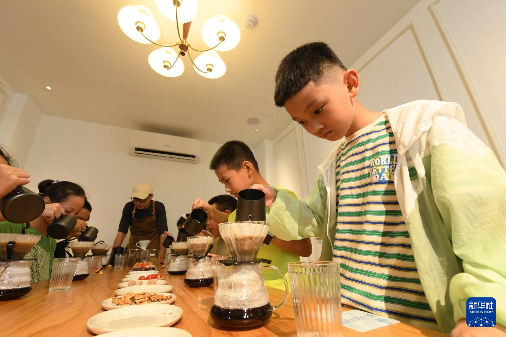 7月19日,青少年在小西街一家咖啡馆体验手冲咖啡制作。