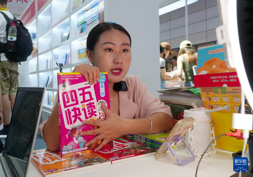 7月27日,在第31届全国图书交易博览会上,一名出版社的工作人员在进行网络直播销售图书。