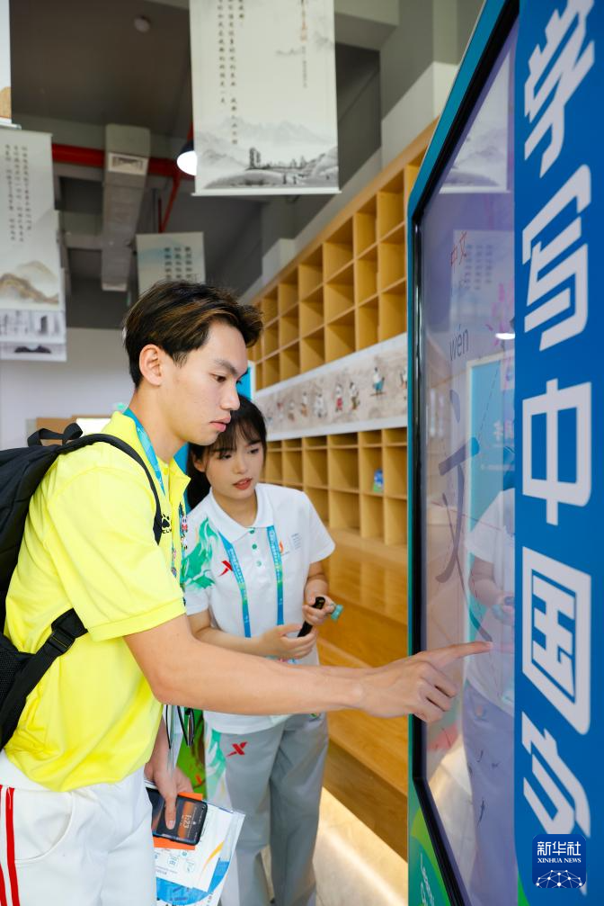 7月31日,在成都大运村的“汉语桥”中文学习互动体验区,菲律宾运动员雷蒙德·巴勃罗 (左)通过数字互动电子屏学写汉字。