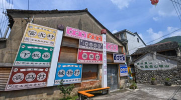 8月11日拍摄的葛家村的一户艺术庭院外墙上展示的当地传统美食宣传画。