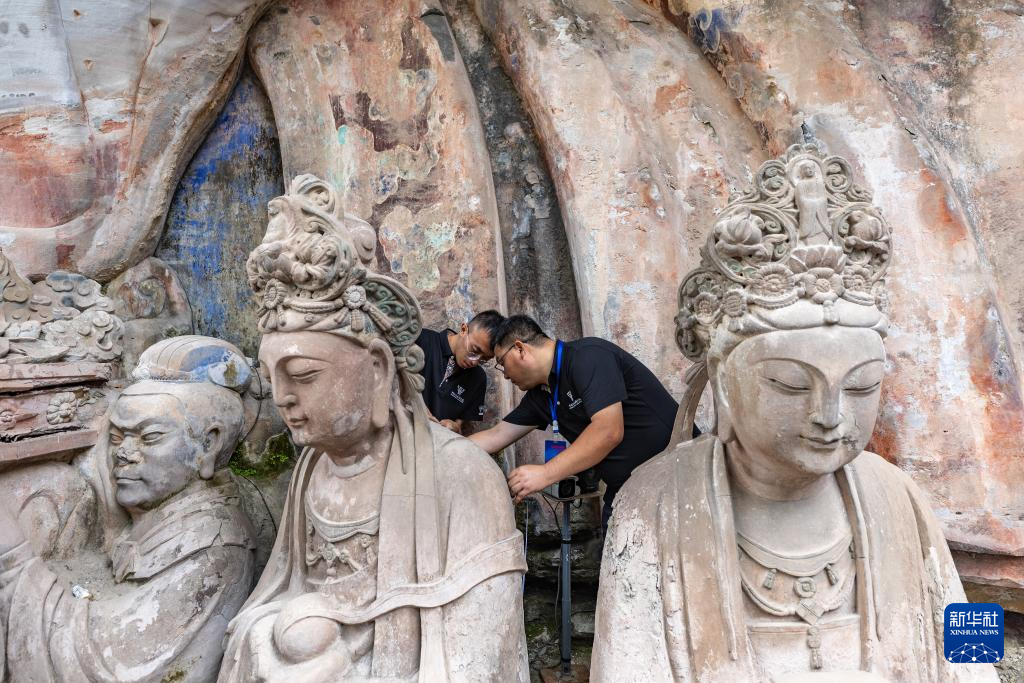 8月19日,在大足石刻宝顶山景区,工作人员对石刻造像病害进行处理。