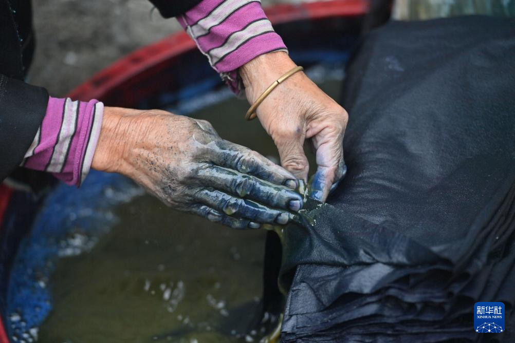 乌英苗寨妇女潘花迷在给布料上浆染色(2023年9月2日摄)。