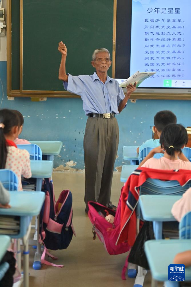 在梧州市长洲区长洲镇泗洲小学,陈明仲在教孩子们唱下俚歌(9月5日摄)。