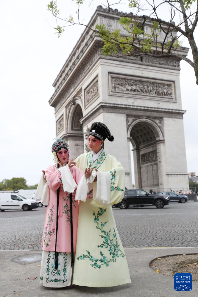 9月13日,江苏省演艺集团昆剧院院长施夏明(左)和江苏省演艺集团昆剧院国家一级演员孔爱萍在法国巴黎凯旋门附近参加昆曲快闪。