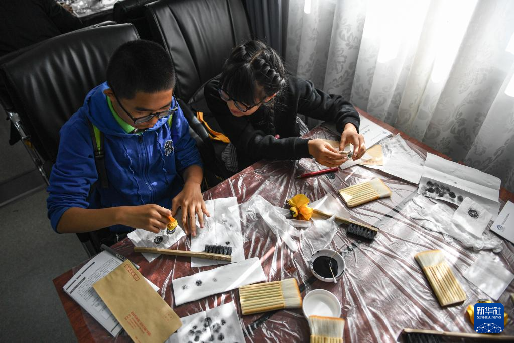 10月21日,一名小朋友向家长展示她制作的铜钱拓片。