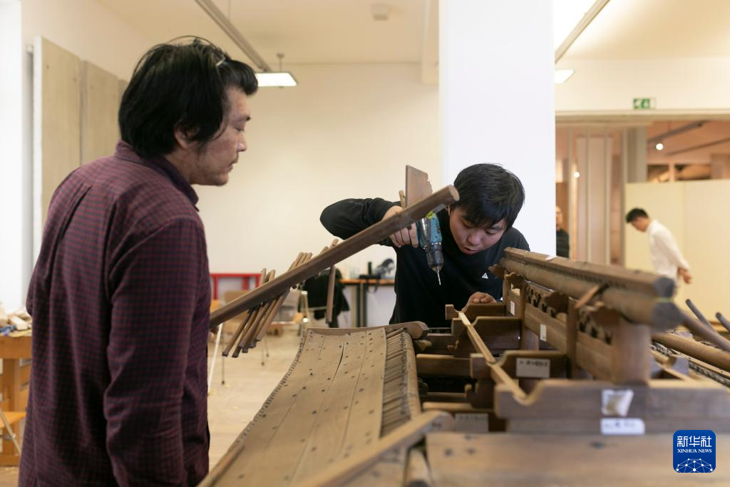 10月16日,在斯洛文尼亚卢布尔雅那的民族志博物馆,故宫博物院专家侯腾龙(左)、黄齐成修复中国古建筑室内装饰。