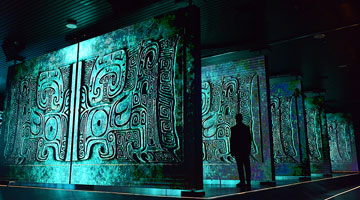 2月26日,参观者在河南安阳殷墟博物馆新馆内观看“亚长”铜方尊。