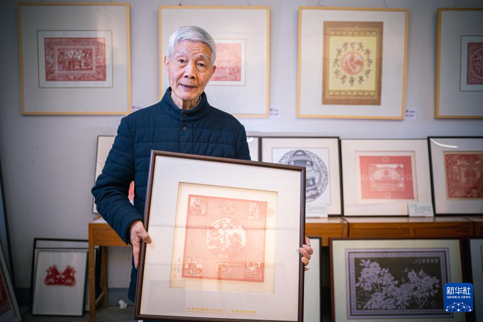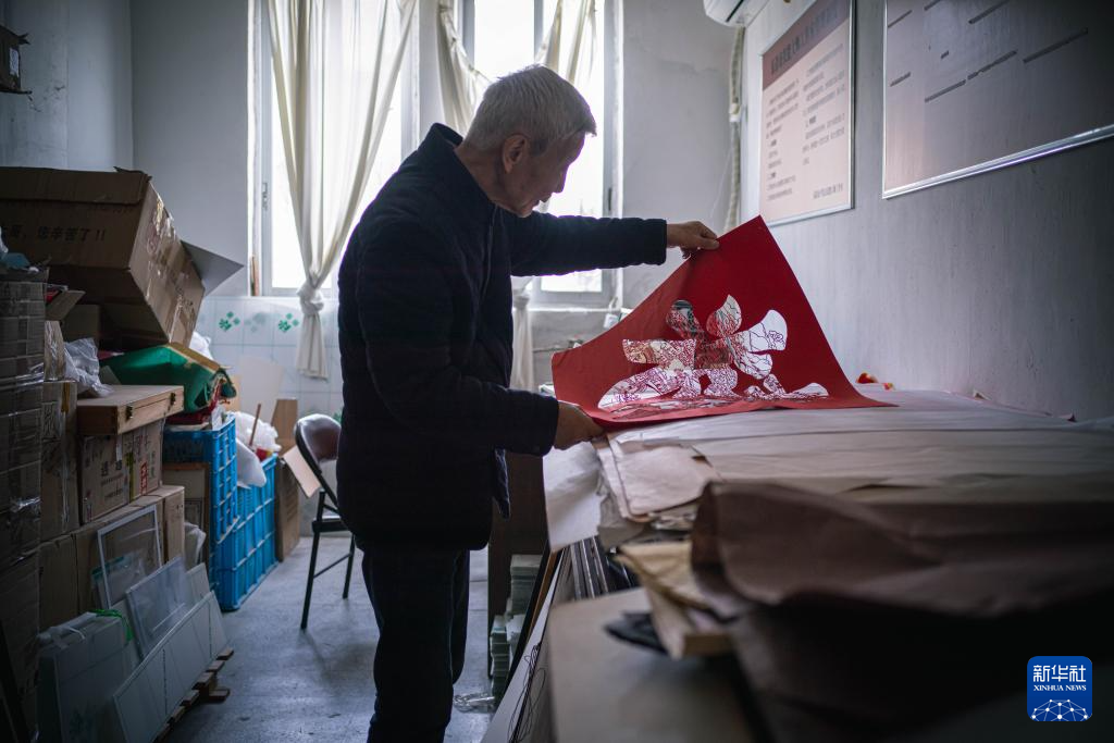 卢发良在工作室内展示自己的细纹刻纸作品“中国年”(3月12日摄)。