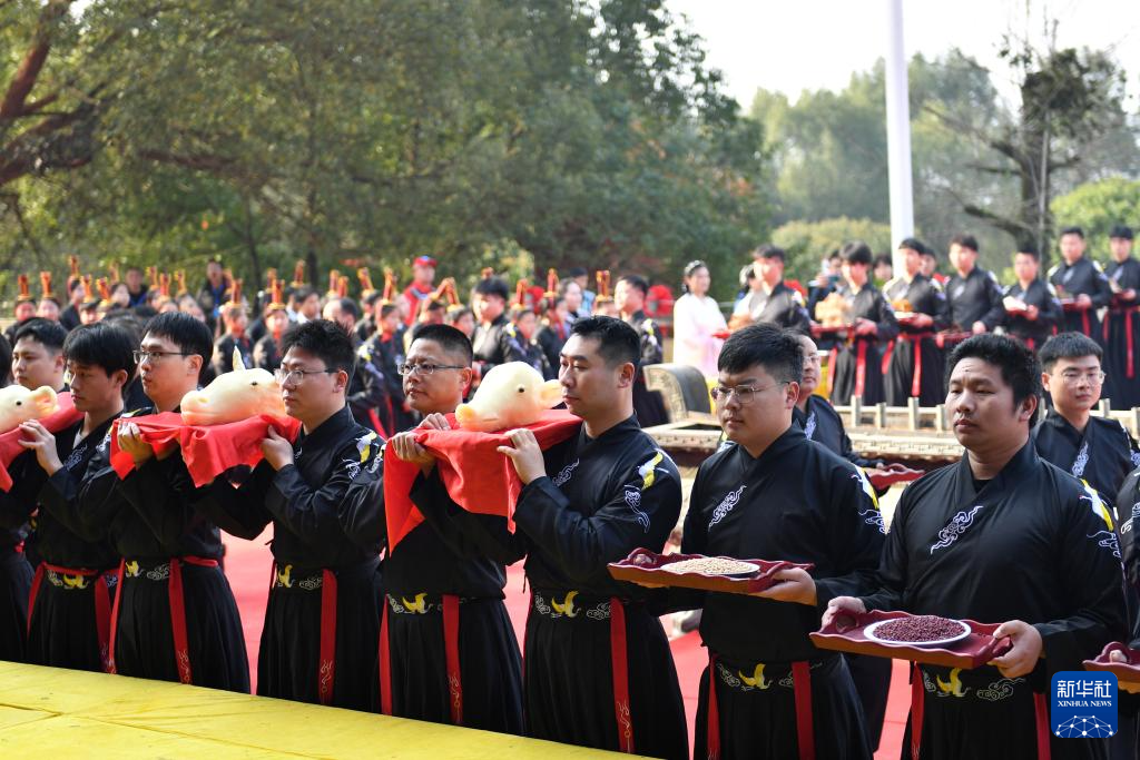 3月20日,在安仁县2024年祭祀炎帝神农典礼现场,祭祀人员向神农炎帝敬献贡品。