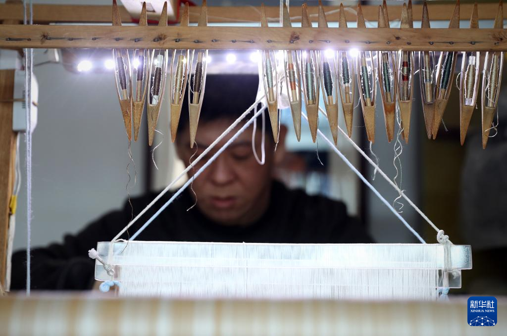 4月9日,在位于营口市的家中,申涛左手拿着缠着丝线的梭子,右手拿着梳理丝线的拨子进行缂丝作品创作。