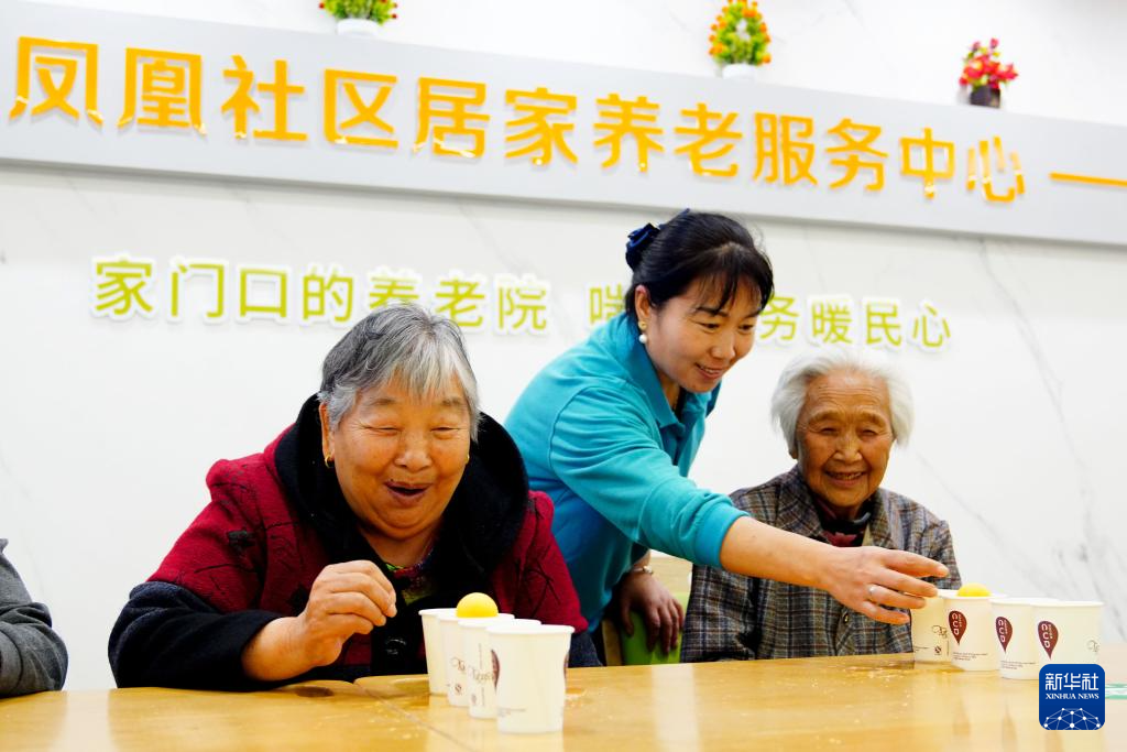 4月14日,在菏泽市巨野县凤凰社区党群服务中心居家养老服务中心,老人在工作人员陪护下玩吹球游戏。