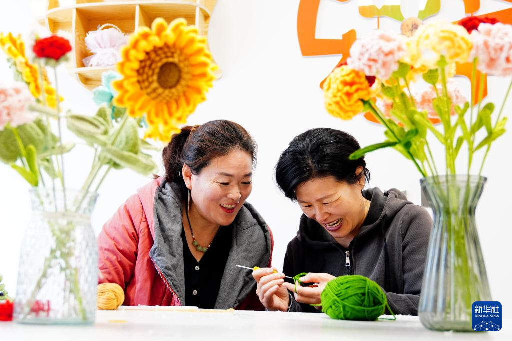 4月14日,在菏泽市巨野县凤凰社区党群服务中心“巧手工坊”,居民正在钩织手工艺品。