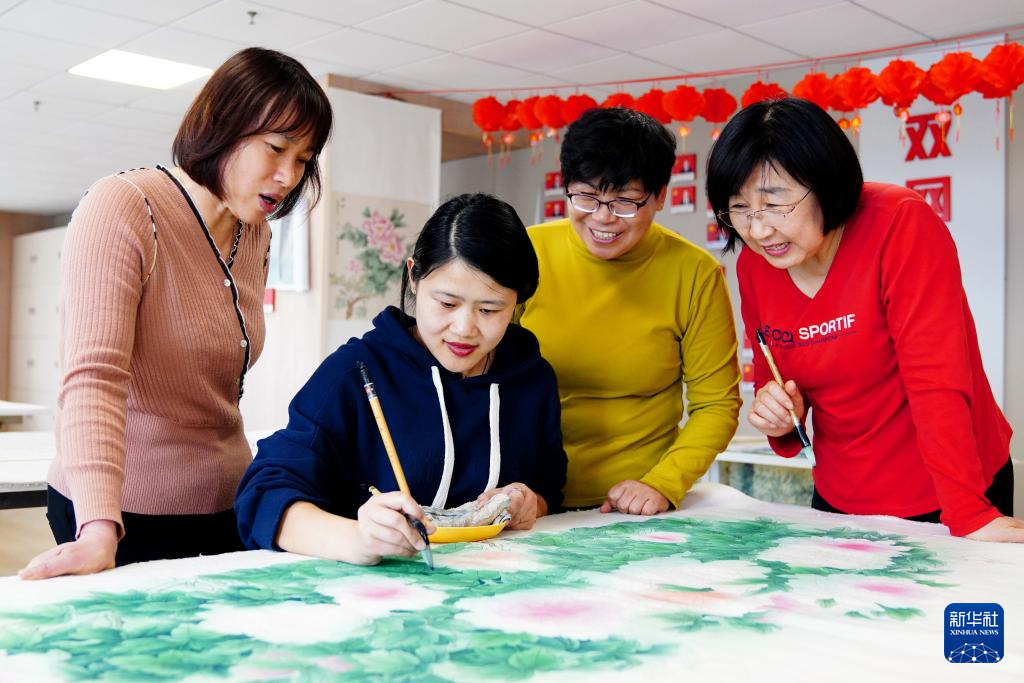 4月14日,在菏泽市巨野县凤麟社区党群服务中心牡丹画室,居民在工笔牡丹画公益培训班学习绘画技艺。