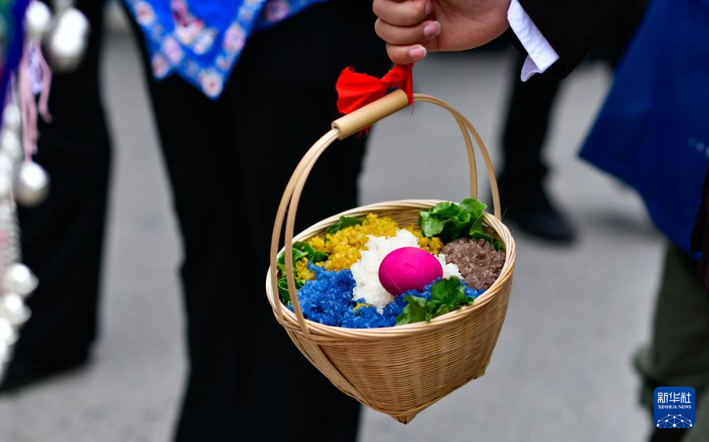 4月21日,苗族群众挑着姊妹饭和鸡蛋参加苗族姊妹节盛装游演。