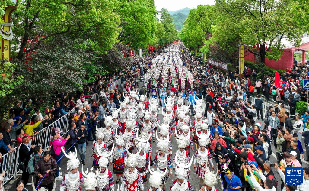 4月21日,苗族群众参加台江苗族姊妹节盛装游演。