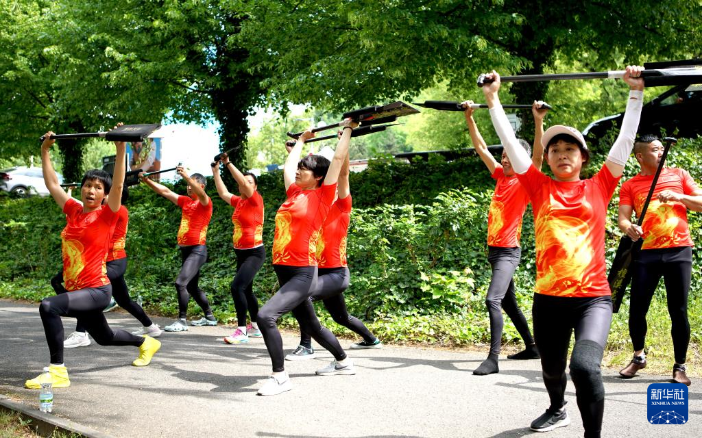 5月11日,在捷克首都布拉格举行的第27届布拉格龙舟节上,来自浙江省浦江县的龙舟队队员赛前热身。