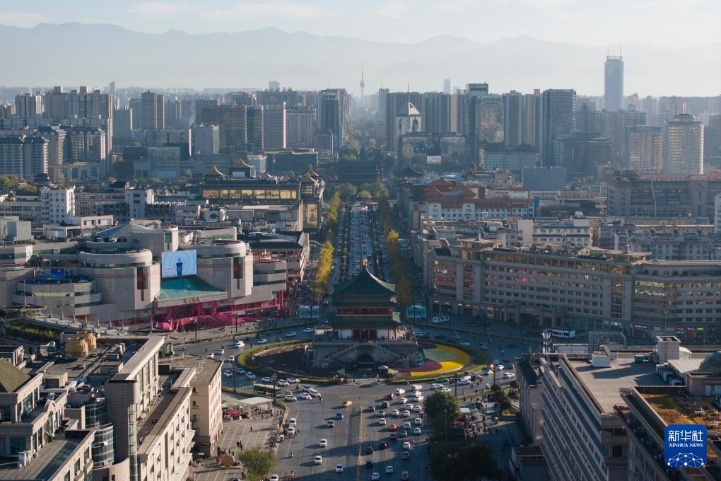 俯瞰西安市钟楼及城区(2023年11月17日摄,无人机照片)。