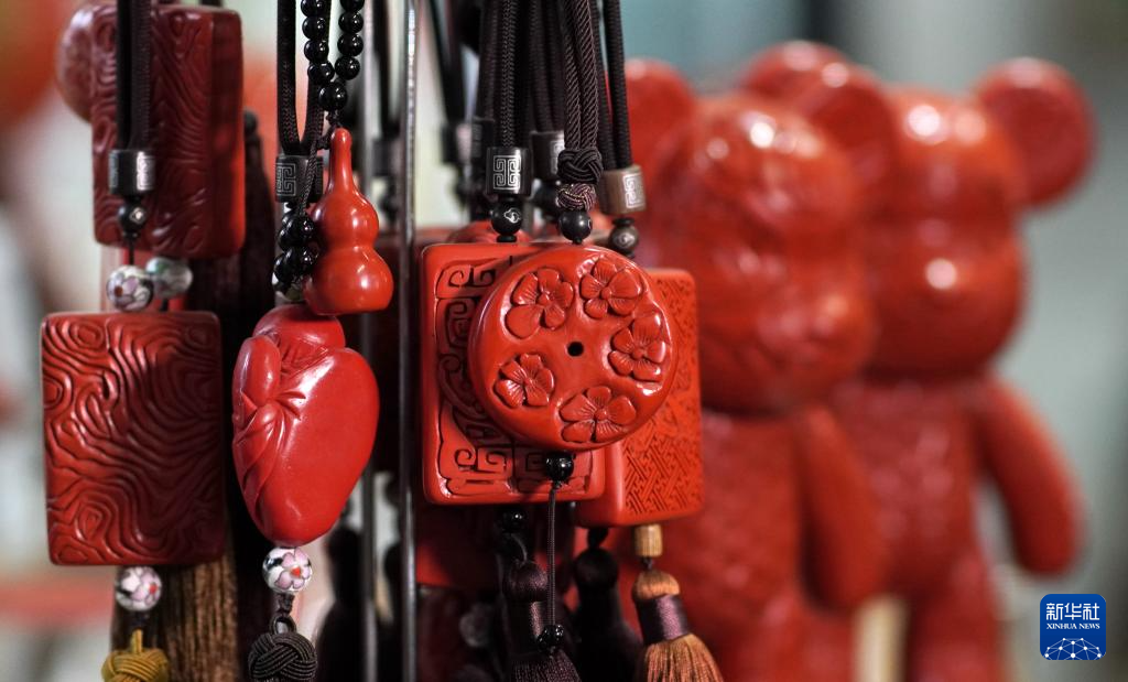 朱江设计制作的适合年轻人的雕漆配饰(6月5日摄)。