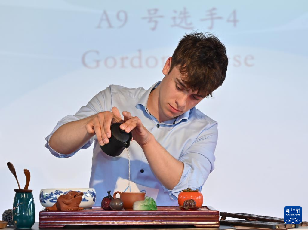 6月8日,在德国汉堡,选手在第十七届“汉语桥”世界中学生中文比赛暨第四届“汉语桥”世界小学生中文秀德国赛区决赛上表演茶艺。