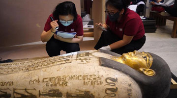 5月23日,在位于埃及首都开罗的埃及国家博物馆,上海博物馆的工作人员对一件木乃伊棺盖进行检查。