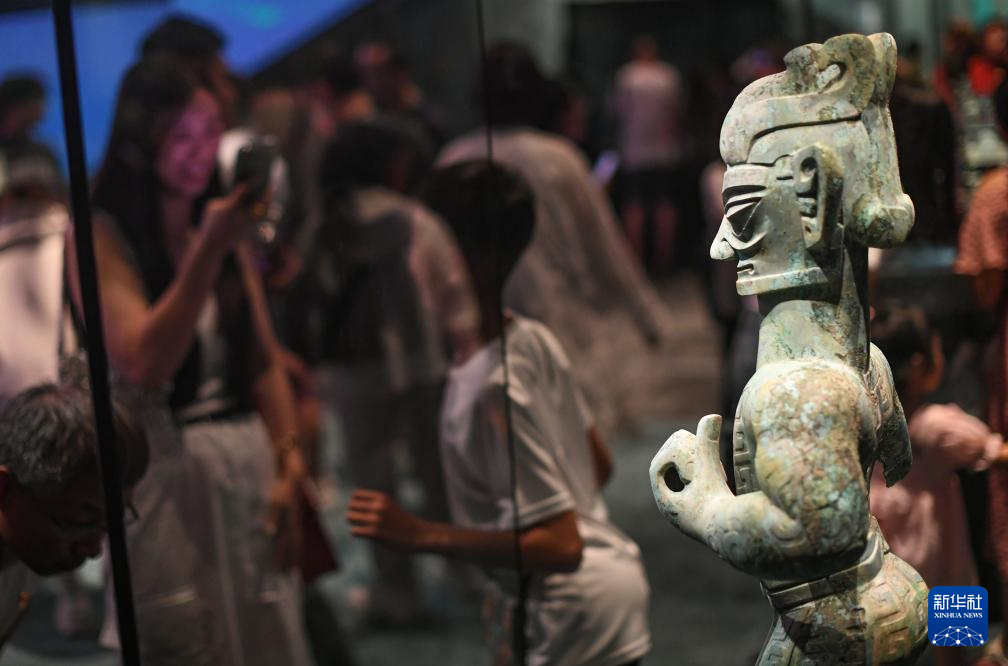 6月27日,观众在观看展品青铜大立人(复制品)。