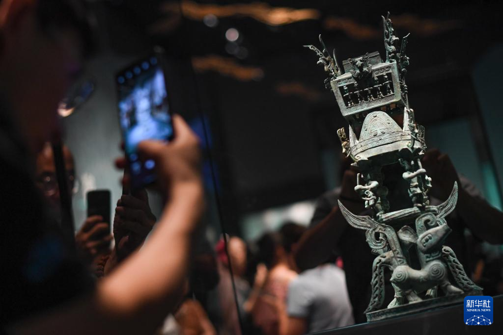 6月27日,观众在拍摄展品祭器模型(复制品)。