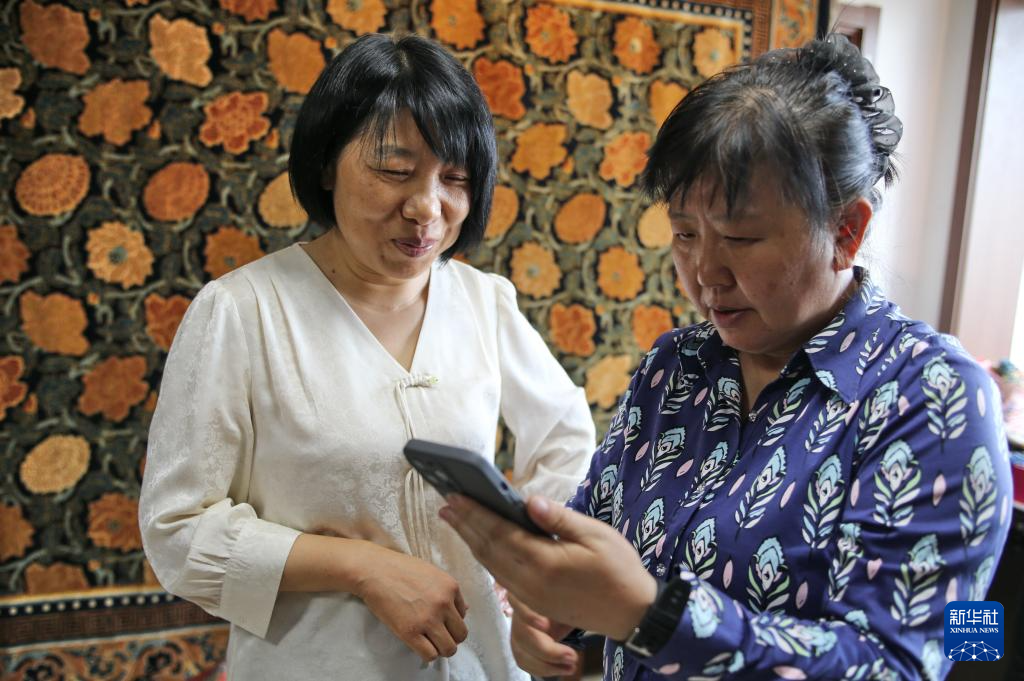 6月27日,在位于北京十里河的工作室,冀豫(左)和国家级非物质文化遗产“宫毯织造技艺”代表性传承人王国英在讨论一块宫毯的彩色样稿。