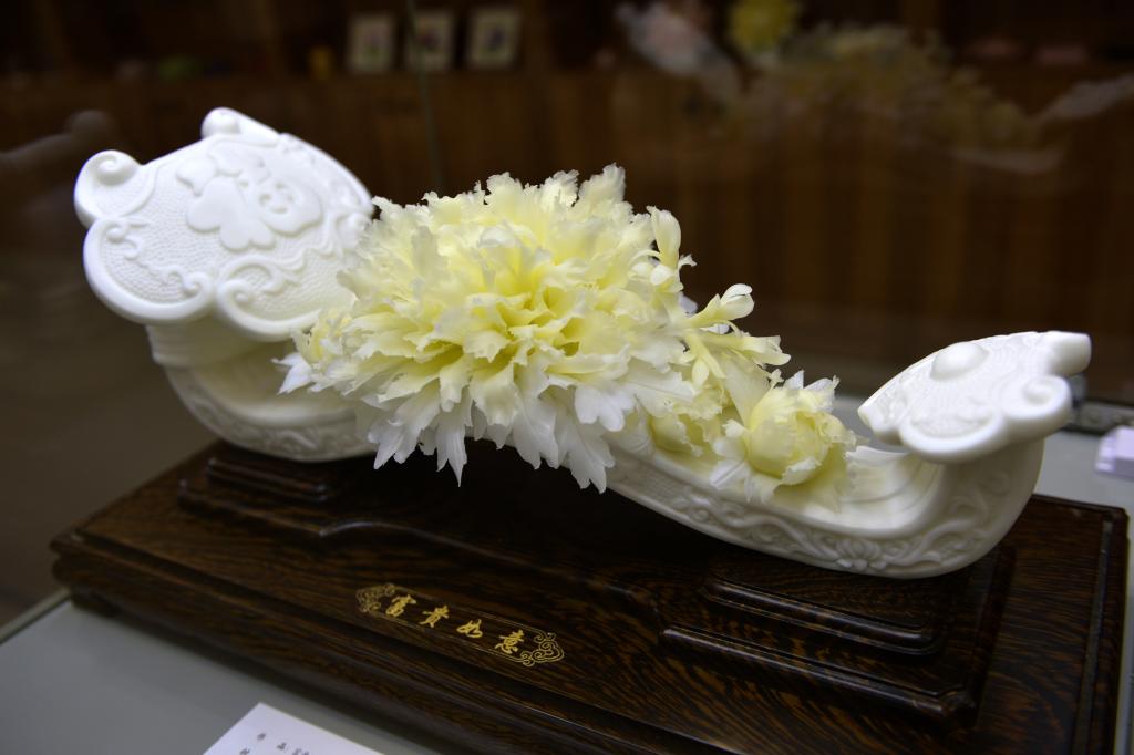 这是6月27日在菏泽非遗传承馆拍摄的3D立体牡丹陶瓷作品。新华社记者 刘力航 摄
